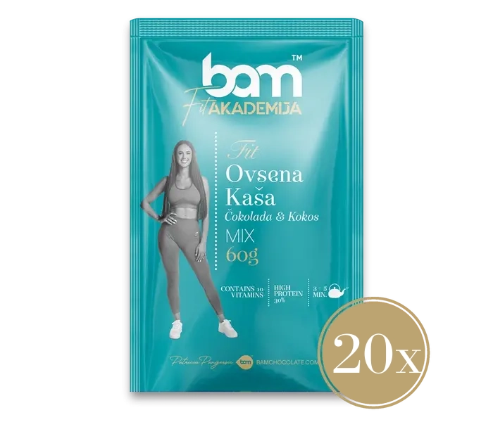 FIT Śniadanie, Czekolada i Kokos, zawiera 20 sztuk Owsianki BAM o smaku czekoladowo-kokosowym. BAM Owsianka z czekoladą i kokosem (60 g) to doskonały posiłek białkowy, który dostarcza niezbędnego białka, aby wspierać aktywny tryb życia. Płatki owsiane o smaku czekoladowym i kokosowym to obfite śniadanie, orzeźwiający posiłek potreningowy lub smaczna przekąska w południe.