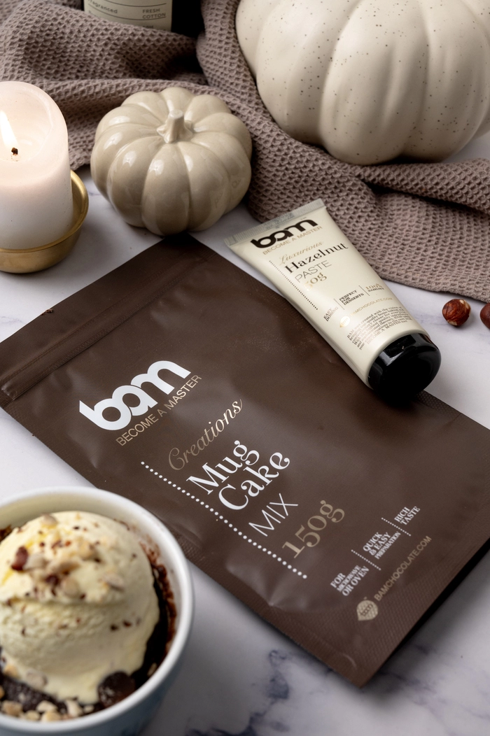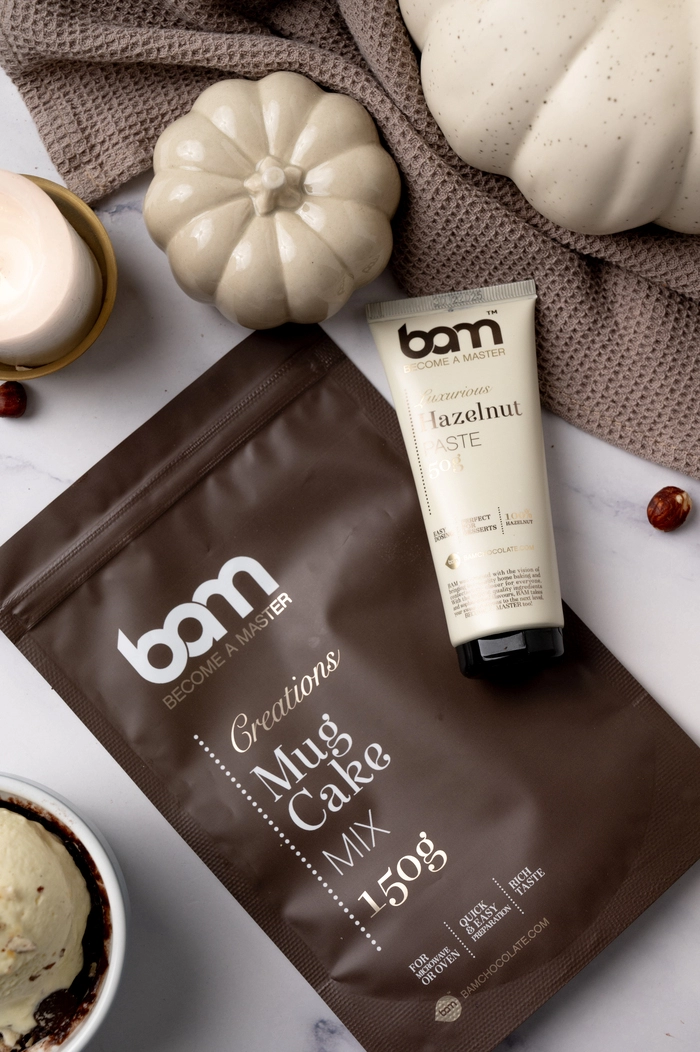 BAM Mieszanka na ciasto z kubka Mug cake (150 g) zachwyci Cię łatwością przygotowania i bogatym czekoladowym smakiem. Aby uczynić swój czekoladowy deser jeszcze bardziej wyjątkowym, dodaj pastę z orzechów laskowych lub pistacji BAM - krem ten wzbogaci ciasto o jedwabistą konsystencję i intensywny smak. Wypróbuj różne pasty lub dżemy, aby za każdym razem odkrywać nowe smaki.