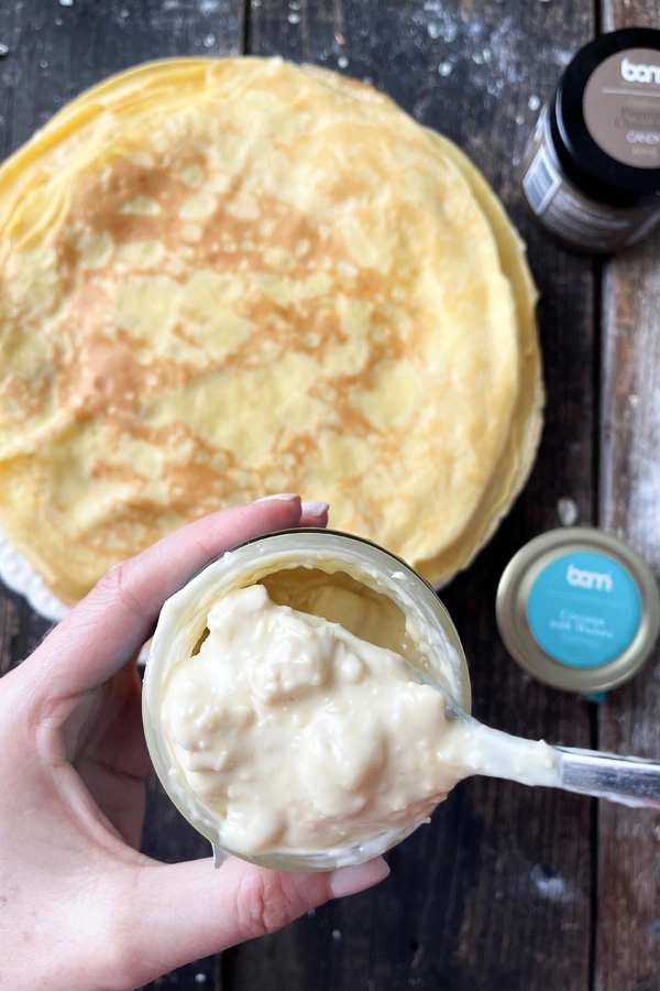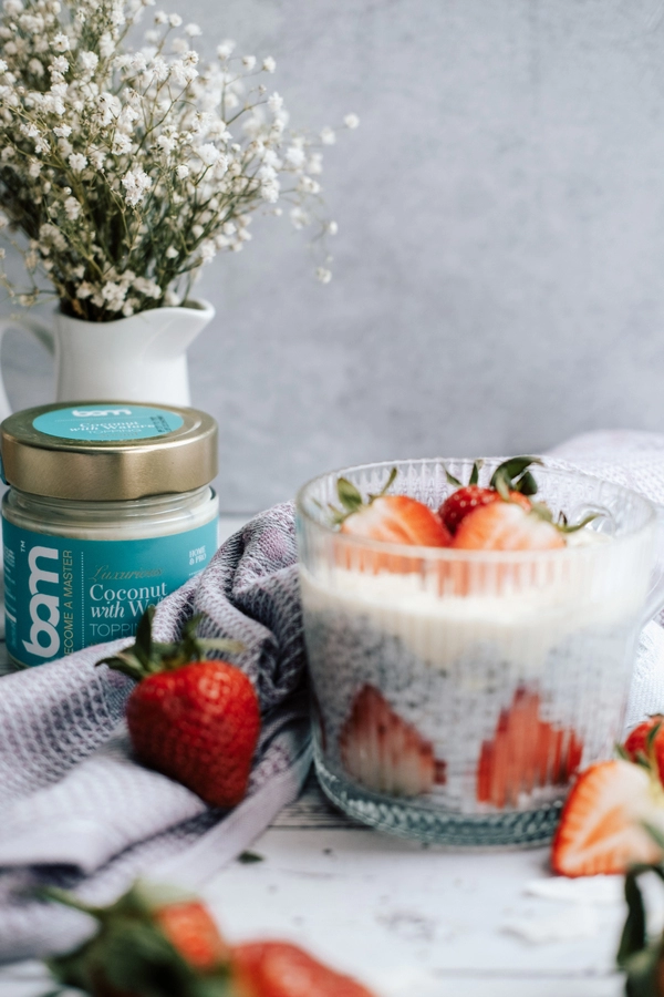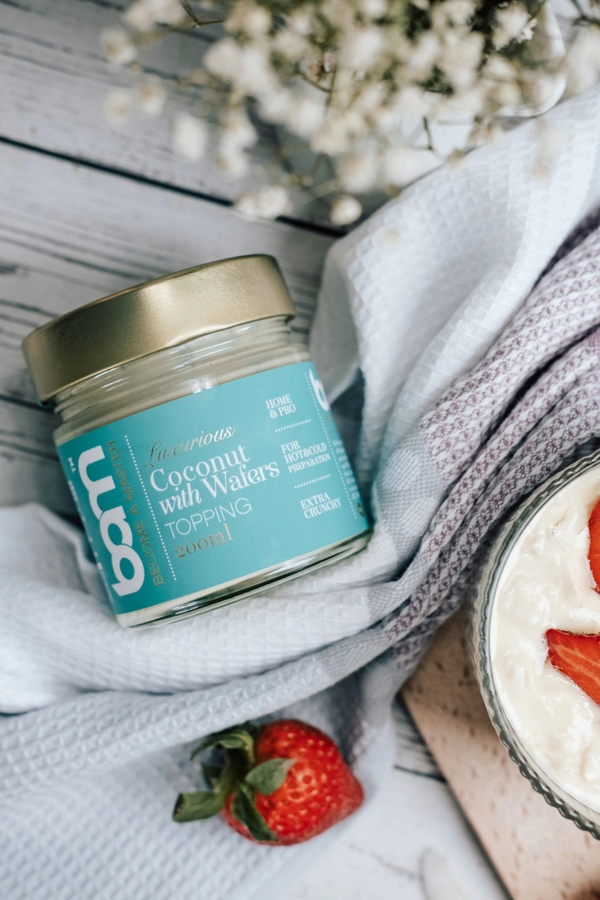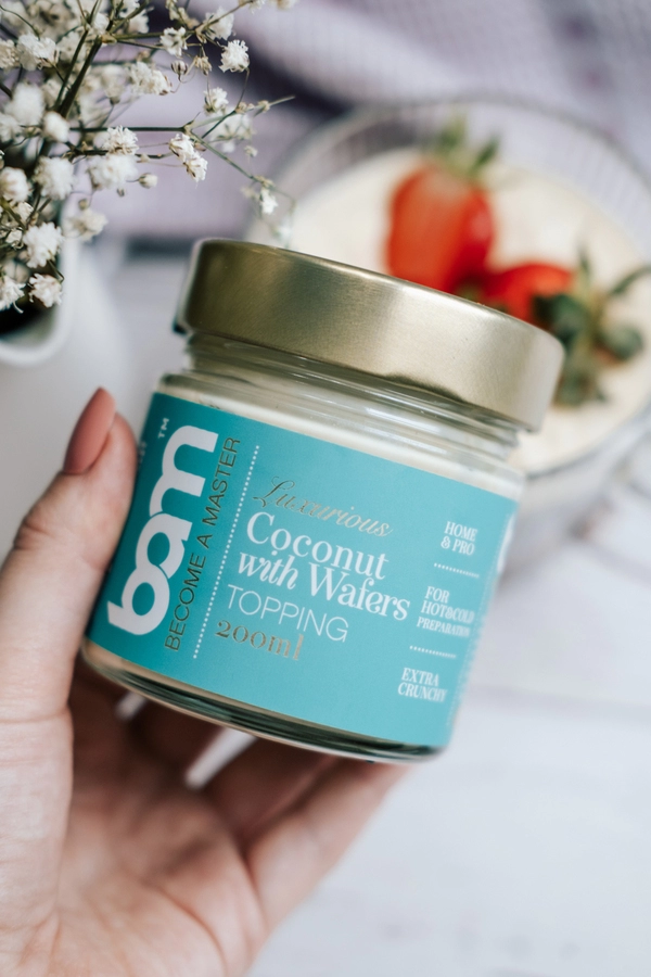 BAM Kokos z Wafelkami (200 ml) zachwyci wyrazistym smakiem białej czekolady i egzotycznych płatków kokosowych. Do pysznego kremu dodano pyszne i chrupiące wafelki, które dodatkowo wzbogacają smak i konsystencję polewy. Połączenie białej czekolady, płatków kokosowych i chrupiących wafelków tworzy kremową strukturę, która świetnie sprawdzi się jako nadzienie do różnych deserów. Wzbogaci smak lodów swoim lekko egzotycznym smakiem. Stanie się niezastąpionym dodatkiem do naleśników lub jako nadzienie w rogalikach. Można z niego zrobić słynne ciastka na patyku lub po prostu posmarować nim pieczywo.