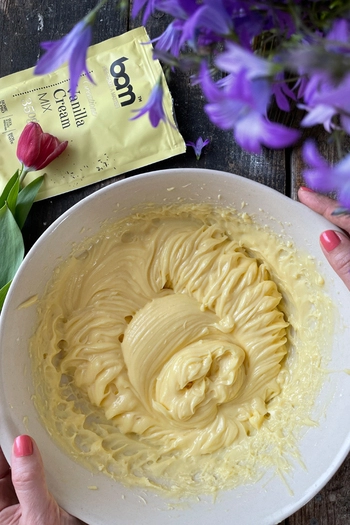 Zestaw Quick Dessert zawiera mieszankę kremu waniliowego BAM (350 g), liofilizowane truskawki (40 g) i pastę z orzechów laskowych z kakao (200 g). Krem waniliowy z pewnością zasługuje na swoją nazwę. Jest łatwy w przygotowaniu, a rezultatem jest gładki krem o bogatym waniliowym smaku. Wszystko, czego potrzebujesz, to mleko, więc nawet początkujący cukiernicy mogą zacząć ją przygotowywać.