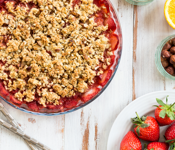 Ciesz się pysznym domowym ciastem truskawkowym z chrupiącą kruszonką owsianą. Ten prosty przepis łączy w sobie świeże truskawki z bogatą mieszanką chrupiących płatków i bezkalorycznego naturalnego słodzika BAM, upieczone na idealny złoty kolor.