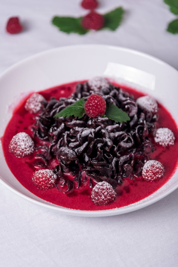 składniki na czekoladowy makaron z kremem malinowym