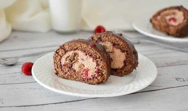 Rozwinąć ciasto i odkleić papier do pieczenia (na którym pieczony był biszkopt). Całkowicie posmarować biszkopt dżemem malinowym; na dżem wyłożyć krem czekoladowy i rozprowadzić go równomiernie nożem, pozostawiając 5 cm nieposmarowanego brzegu (w przeciwnym razie krem wycieknie na końcu podczas zwijania). Wciśnij świeże maliny w krem na brzegu ciasta w miejscu, w którym ma być zwinięty rulon i zwiń ciasto ciasno w rulon, używając papieru do pieczenia pod spodem. Zawinąć roladę w folię i włożyć do lodówki, aby się schłodziła i stwardniała.